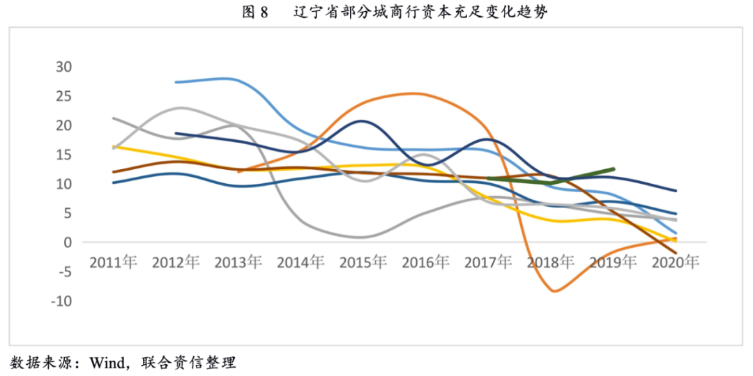 資產充足水平方面,近年來,遼寧省城商行通過利潤留存、增資擴股以及發行二級資本債券、優先股等手段補充資本,整體資本水平較為充足,但部分城商行資本充足水平出現一定程度的下降。一方面,受盈利水平下滑的影響,部分城商行資本內生能力有所減弱;另一方面,部分城商行信貸資產質量下行導致撥備水平不足,對資本造成較大的沖減,資本面臨補充壓力。