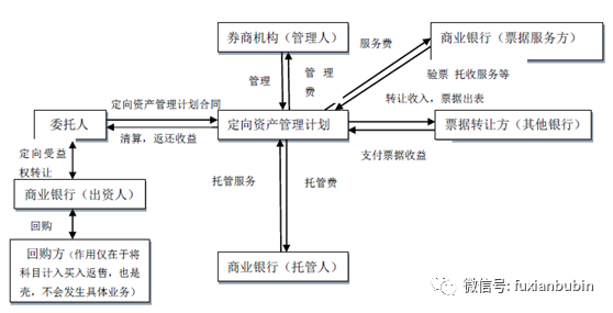 商業(yè)銀行理財資金或自有資金委托券商機構(gòu)成立定向資產(chǎn)管理計劃,投資于銀行承兌匯票或商票,以到期承兌票款實現(xiàn)投資收益。這一業(yè)務(wù)設(shè)計主要是將票據(jù)資產(chǎn)從表內(nèi)轉(zhuǎn)移到表外,擴大信貸規(guī)模。券商只是資管計劃的殼,銀行負責驗票和托收,已被127號文叫停。業(yè)務(wù)流程如下圖: