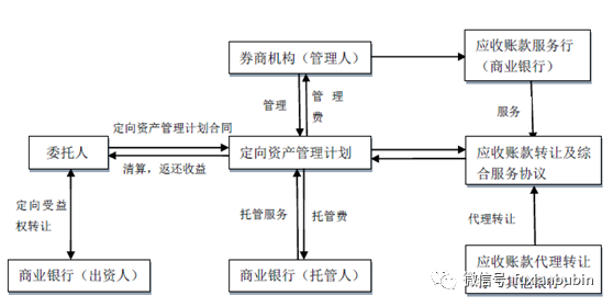 商業(yè)銀行理財資金或自有資金委托券商機構(gòu)成立定向資產(chǎn)管理計劃,投資于應(yīng)收賬款等具有穩(wěn)定現(xiàn)金回報收益特征的資產(chǎn)。業(yè)務(wù)流程如下圖: