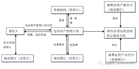 商業(yè)銀行理財資金或自有資金委托券商機構(gòu)成立定向資產(chǎn)管理計劃,投資于信用證等福費廷資產(chǎn)。業(yè)務(wù)流程如下圖: