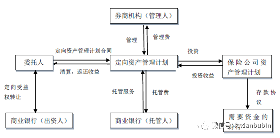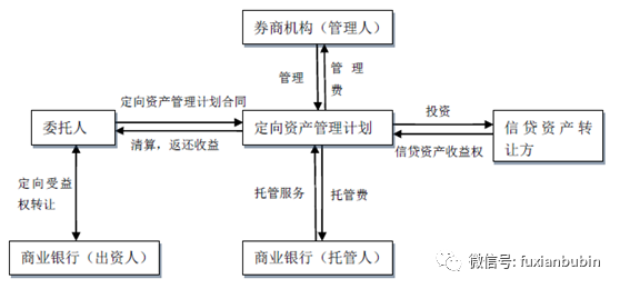 商業(yè)銀行理財資金或自有資金委托券商機構(gòu)成立定向資產(chǎn)管理計劃,投資于存量信貸資產(chǎn)。業(yè)務(wù)原先主要是用于表內(nèi)轉(zhuǎn)表外或調(diào)整信貸規(guī)模,業(yè)務(wù)流程如下圖: