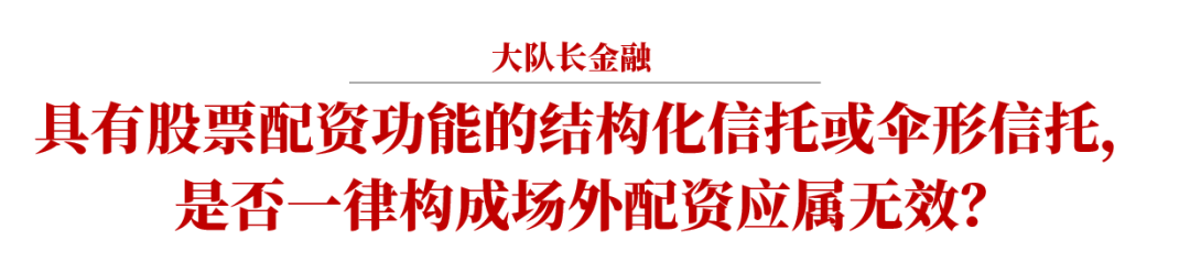 根據(jù)2019年11月發(fā)布的《全國法院民商事審判工作座談會(huì)紀(jì)要》(以下簡(jiǎn)稱《九民紀(jì)要》)第86條的規(guī)定,場(chǎng)外配資合同無效。最高人民法院民事審判第二庭在其編著的《全國法院民商事審判工作會(huì)議紀(jì)要理解與適用》一書中認(rèn)為:“單一資金信托業(yè)務(wù)屬于信托公司正規(guī)的證券投資信托方式,也稱陽光私募,其投資收益和風(fēng)險(xiǎn)不分層,依法成立的單一資金信托合同應(yīng)屬有效。對(duì)于在本輪股市劇烈波動(dòng)中引發(fā)巨大爭(zhēng)議的結(jié)構(gòu)化信托和傘形信托合同效力問題,我們認(rèn)為,對(duì)于具有股票配資功能的結(jié)構(gòu)化信托和傘形信托,應(yīng)當(dāng)認(rèn)定為場(chǎng)外配資合同,在信托公司未取得融資融券國家特許經(jīng)營許可的情況下,應(yīng)當(dāng)認(rèn)定合同無效。”[1]