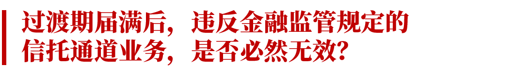 《九民紀(jì)要》第93條對(duì)通道業(yè)務(wù)的含義、效力,《資管新規(guī)》過渡期安排等進(jìn)行了明確。目前《資管新規(guī)》過渡期已延長(zhǎng)至2021年底。基于《九民紀(jì)要》的規(guī)定,在過渡期內(nèi)的通道業(yè)務(wù),如果不存在其他無效事由的,將被認(rèn)定為有效。那么,根據(jù)該條規(guī)定,是否可以得出過渡期之后的通道業(yè)務(wù),將必然被認(rèn)定為無效的結(jié)論。