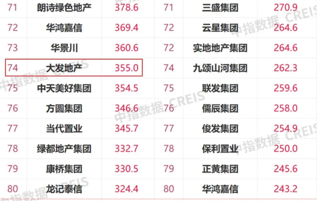 中指院的這份榜單里,第100位的大唐地產權益銷售額為190.3億元,如此來看,大發(fā)地產的權益銷售額應該低于這個數(shù)字。