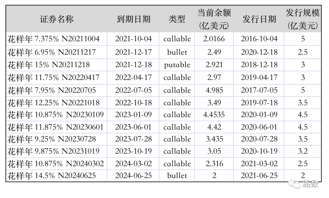 在美元債占總?cè)谫Y結(jié)構(gòu)比重超過50%的若干房企中,花樣年還要加上條:集中兌付壓力。