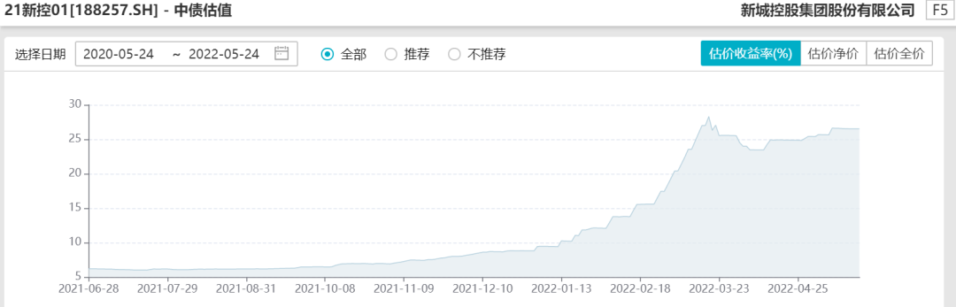 直到新城控股這單CRMW的橫空出世,標(biāo)的主體新城控股是典型的困境發(fā)行人,本輪民營地產(chǎn)風(fēng)險爆發(fā)以來,新城控股也是一直處在風(fēng)口浪尖上,雖然沒有像花樣年和融創(chuàng)那樣完全躺平,但是其估值已經(jīng)是扶搖直上,1年期到期收益率目前超過了26%的水平。
