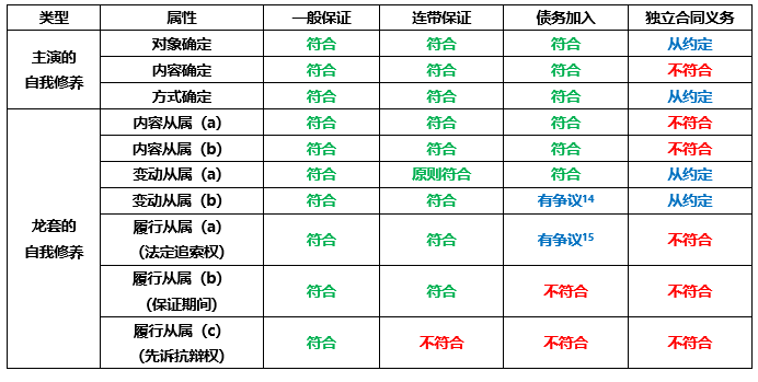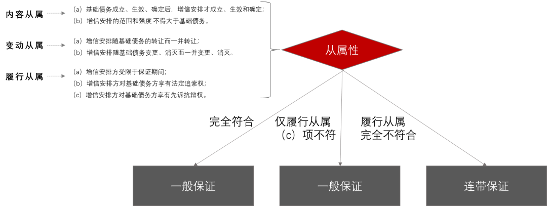 關于從屬性的界定,有許多學者提出了不同的看法。在我看來,最有助于區分增信類型的,是下面的幾個特征: