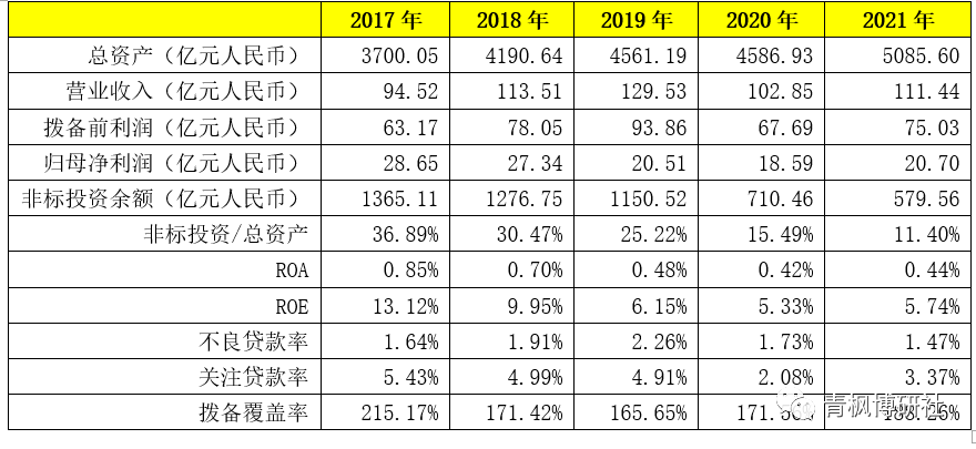 1、盈利能力整體偏低,雖然2021年營收、撥備前利潤、歸母凈利潤均保持著不錯的正增長幅度,但2021年的營收與撥備前利潤絕對值均低于2018年與2019年、2021年的歸母凈利潤絕對值低于2017-2019年,ROA與ROE亦均處于比較低的水平。