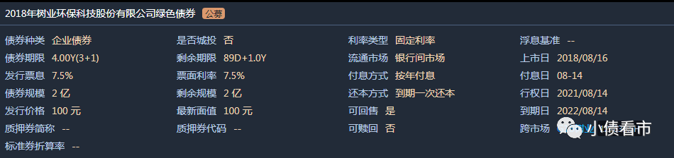 《小債看市》統計,目前樹業環保僅存續1只綠色債券“18樹業環保綠色債”,存續規模兩億元,將于今年8月14日回售,明年8月14日到期。