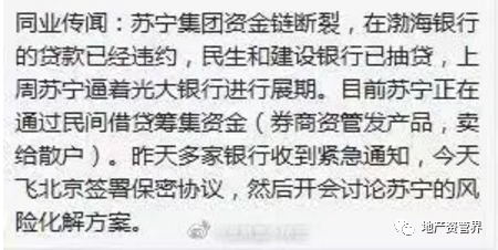 去年年底,有媒體報道稱,有傳言表示蘇寧集團資金鏈斷裂,在渤海銀行的貸款已經違約,民生和建設銀行已抽貸,上周蘇寧逼著光大銀行進行展期。目前蘇寧正在通過民間借貸籌集資金(券商資管發產品,賣給散戶)。