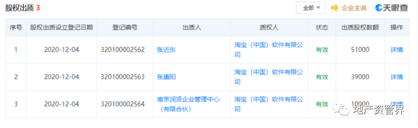 12月10日,國家企業信用信息公示系統披露:蘇寧控股集團及南京潤賢企業管理中心(有限合伙)已經將公司股權出質給淘寶,出資人為張近東、其子張康陽,總出質股數為10萬股,合計出質股權數額10億元人民幣。