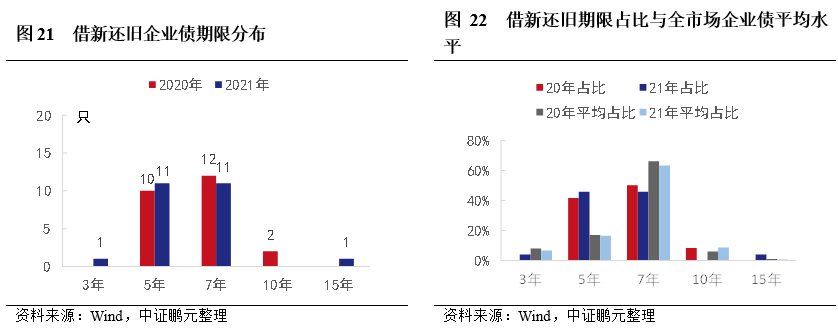 從期限分布看,借新還舊企業(yè)債主要為5年期和7年期品種,發(fā)行數(shù)量占比分別為44%和48%,其他期限品種發(fā)行較少。與企業(yè)債平均期限比,借新還舊企業(yè)債中5年期品種明顯較高,7年期品種相對(duì)較少。