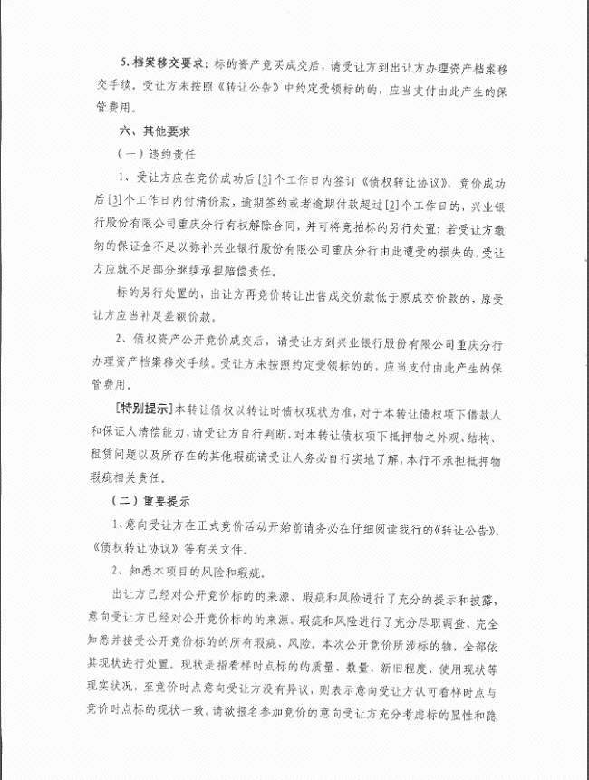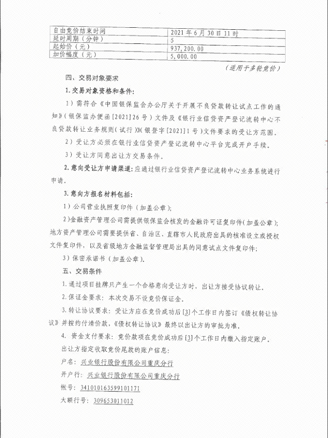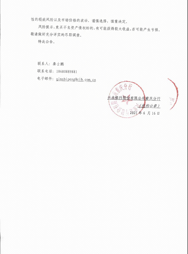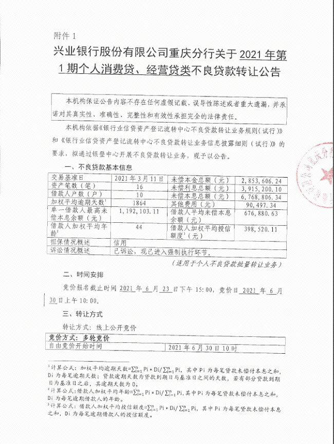 附:興業銀行股份有限公司重慶分行關于2021年第1期個人消費貸、經營貸類不良貸款轉讓公告
