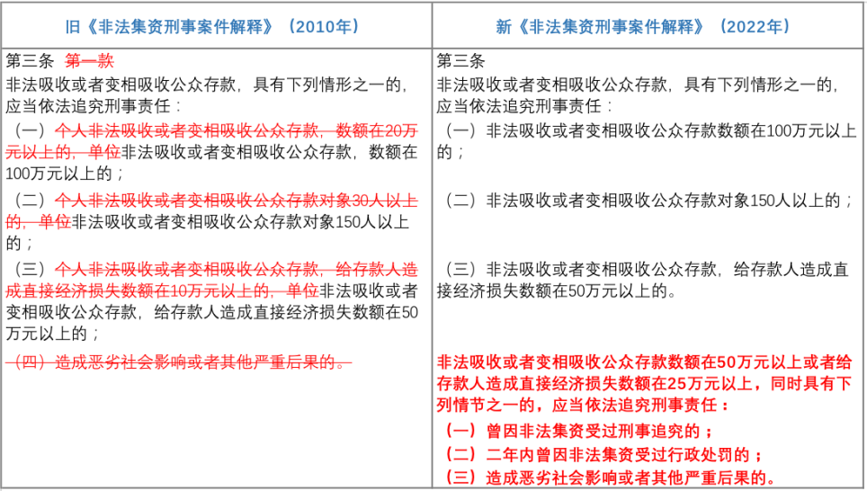 其中需要特別強調的在于,就非法吸收公眾存款罪的“立案標準”而言,新《非法集資刑事案件解釋》站在注重特殊預防的角度,針對行為人的再犯危險性進行評價。故而在非吸數額或者非吸造成損失數額僅達入罪標準的一半的情況下,若行為人曾因非法集資受過刑事處罰或者2年內因非法集資受過行政處罰的,也會被認定構成犯罪。