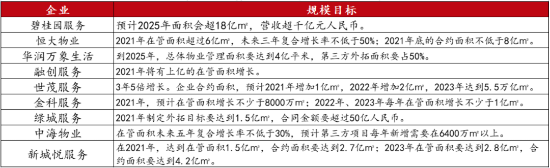 頭部企業更是定下高達數億的增長目標,恒大物業2021年在管面積將破6億㎡,合約面積不低于8億㎡;綠城服務合約面積將新增1.5億㎡,碧桂園服務則表示2025年規模超18億㎡,營收要超過千億元。世茂服務亦提出3年5倍計劃,2021年增加合約面積1億㎡,預計2023年合約面積達5.5億㎡。