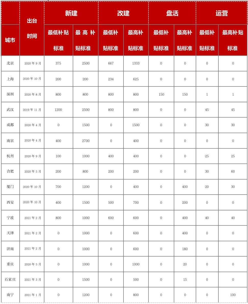 不同城市之間補(bǔ)貼標(biāo)準(zhǔn)差異較大,整體來(lái)說(shuō)補(bǔ)貼發(fā)放還是以新建、改建類(lèi)項(xiàng)目補(bǔ)貼為主,部分城市對(duì)盤(pán)活類(lèi)、運(yùn)營(yíng)類(lèi)項(xiàng)目有補(bǔ)貼。既所謂的大錢(qián)補(bǔ)供應(yīng),小錢(qián)補(bǔ)運(yùn)營(yíng)。