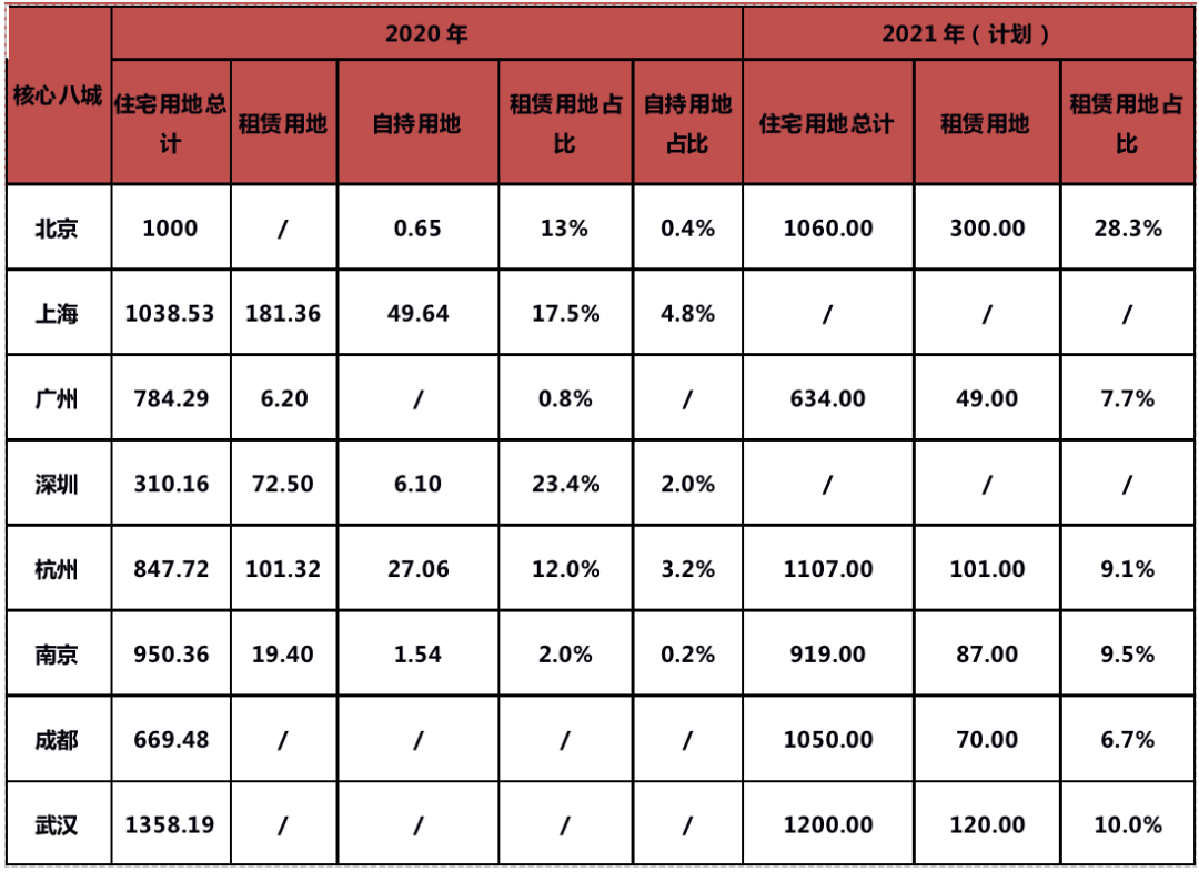 由此看出國(guó)家已經(jīng)從政策層面有效保障的租賃用地的供給,而目前已經(jīng)正式公布2021年住宅用地供應(yīng)計(jì)劃的核心六城也的確印證了這一點(diǎn)。