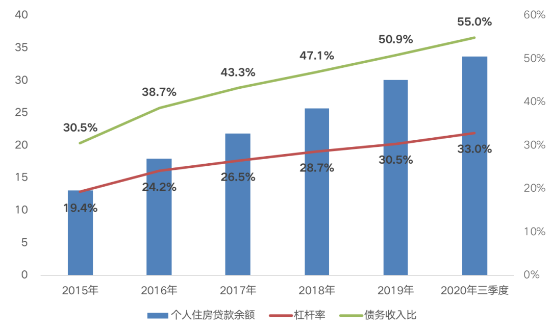 2016年以來,居民持續加杠桿購房,致使杠桿率高企,償債能力大幅減弱。截至2020年三季度,個人住房貸款余額多達33.7萬億元,較2015年凈增長157%,居民杠桿率逐年提升至33%,較2015年增加13.7個百分點,債務收入比升至55%,較2015年增加24.5個百分點。