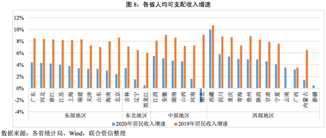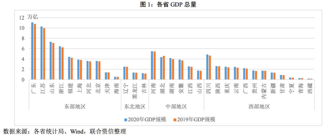?GDP總量在經(jīng)濟相對發(fā)達地區(qū)和欠發(fā)達地區(qū)的分化較為明顯,東部地區(qū)繼續(xù)維持領(lǐng)跑態(tài)勢;2020年,除湖北以外,其余30個省份GDP增速全部轉(zhuǎn)正,中西部地區(qū)增速分化更為明顯,東北地區(qū)經(jīng)濟恢復相對較慢,東部地區(qū)則相對較為均衡。