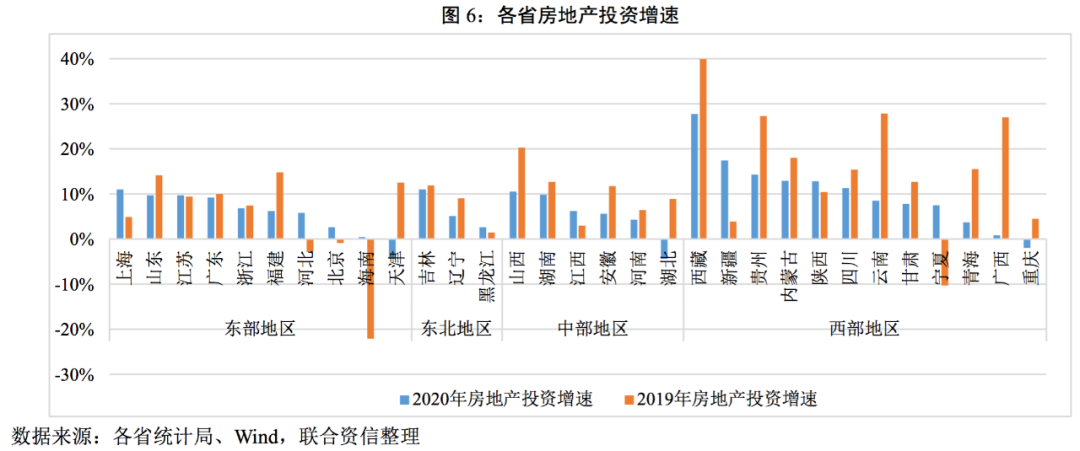 房地產(chǎn)投資方面,2020年31個省份中除重慶、天津以及湖北以外,其余28個省份房地產(chǎn)投資均為正增長;有15個省份房地產(chǎn)增速高于全國增速(7%),且有9個省份的增速已經(jīng)超過2019年同期水平。分區(qū)域看,西部地區(qū)房地產(chǎn)投資增速整體高于其他省份。進一步比較固定資產(chǎn)投資增速與房地產(chǎn)投資增速發(fā)現(xiàn),僅江西、黑龍江、廣西、海南、重慶以及天津的固定投資增速大于房地產(chǎn)投資增速,大部分省份的固定投資增速依賴于房地產(chǎn)投資支撐,與全國投資結(jié)構(gòu)相同。