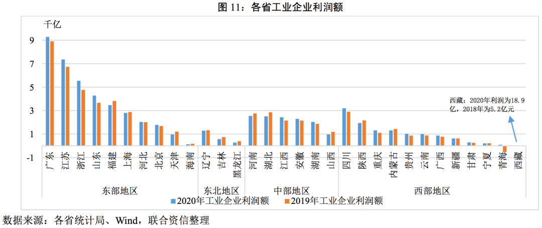 從企業(yè)利潤增速看,2020年工業(yè)利潤增速最大值與最小值差距為44.30%(2019年為42.1%),地區(qū)間的差異較2019年進一步加大。有15個省份工業(yè)企業(yè)利潤為負增長,較2019年減少3個省份;17個省份工業(yè)企業(yè)利潤增速超過2019年。分區(qū)域看,東部、西部和中部地區(qū)各省份分化均較為明顯,且有進一步加劇的趨勢,東北地區(qū)三省全部負增長,主要是因為2020年國際大宗商品價格不景氣在一定程度上壓縮黑色金屬以及石油開采及加工行業(yè)的利潤。