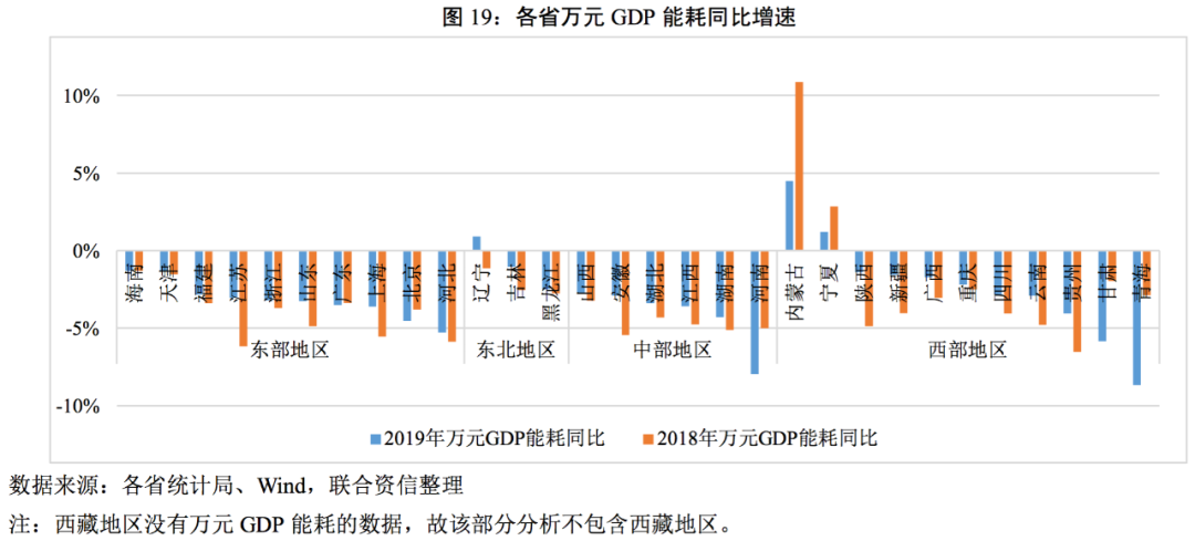 分區(qū)域看,2019年大部分省份的GDP能耗同比均有所下降,而內(nèi)蒙古和寧夏連續(xù)兩年均為正增長,且內(nèi)蒙古的增速高達4.49%,遼寧則由2018年的能耗下降轉(zhuǎn)為2019年的增長。習近平總書記在十九屆五中全會、中央經(jīng)濟工作會議、中央全面深化改革委員會會議等重要會議多次強調(diào)了抓緊制定碳排放達峰與碳中和行動方案,2020年《政府工作報告》規(guī)劃了“十四五”期間我國的能源消耗和碳排放工作。上述政策將會對以鋼鐵和石油化工等傳統(tǒng)工業(yè)為主的省份,如東三省、河北以及天津等,帶來較大的產(chǎn)業(yè)轉(zhuǎn)型壓力,同時對經(jīng)濟增長帶來一定的壓力。