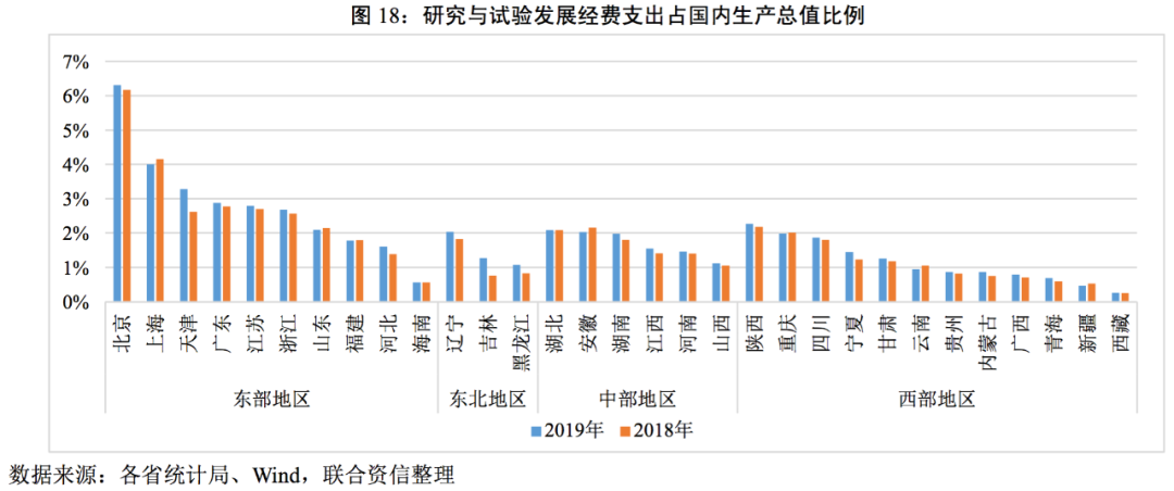 以科研經(jīng)費支出占各省的GDP規(guī)模比例來衡量各省對科研的重視程度,各省的科研經(jīng)費占GDP比例與專利總數(shù)呈現(xiàn)強正關(guān)系。科研經(jīng)費投入作為后期經(jīng)濟效益的核心驅(qū)動力,目前仍然主要集中于東部地區(qū)。經(jīng)濟規(guī)模較大的省份擁有更多的科研能力,科研支出費用占比更大,而科研成果反過來也帶動了當?shù)亟?jīng)濟的發(fā)展,二者形成相互促進的關(guān)系,形成了強者越強的趨勢。