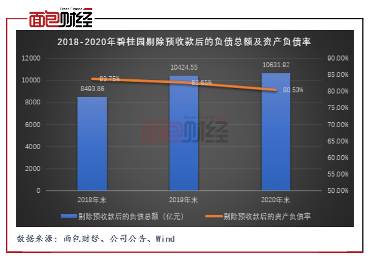根據公司年報數據,截至2020年末,“三道紅線”中碧桂園2條達標,1條越線,屬于“黃檔”房企。其剔除預收款后的資產負債率為80.53%,同比下降2.12個百分點,但仍超過監管指標;凈負債率為62.00%,同比上升6.82個百分點,符合監管要求;現金短債比為1.74,同比下降0.40個百分點,符合監管要求。