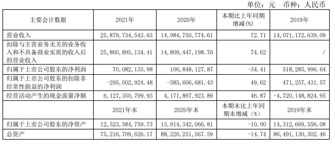 接下來光明地產的營收增速更猛。如下圖年報數據顯示,2021年營收258.8億元,同比增長72.71%。但歸母凈利潤有點慘,同比下跌了34.41%為7008.2萬元。扣非后的凈利潤為負值,2.95億元,不過比2020年同期的-5.86億元縮窄了一些。