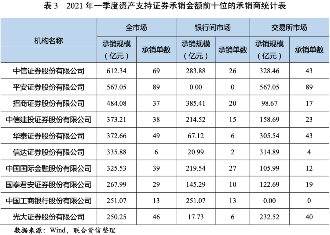 從資產支持證券的承銷情況來看,2021年一季度,中信證券股份有限公司、平安證券股份有限公司和招商證券股份有限公司的承銷金額位居前三;平安證券股份有限公司的承銷單數位居第一,中信證券股份有限公司和華泰證券股份有限公司的承銷單數分別排名第二位和第三位。