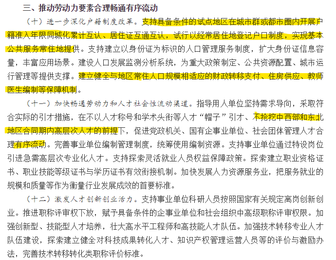 7、讓更多人自由遷徙、市民化,房地產受益,同時強調住房供應保障機制。方案第三部分“推動勞動力要素合理暢通有序流動”,談到支持具備條件的試點地區在城市群或都市圈內開展戶籍準入年限同城化累計互認、居住證互通互認,試行以經常居住地登記戶口制度,實現基本公共服務常住地提供。
