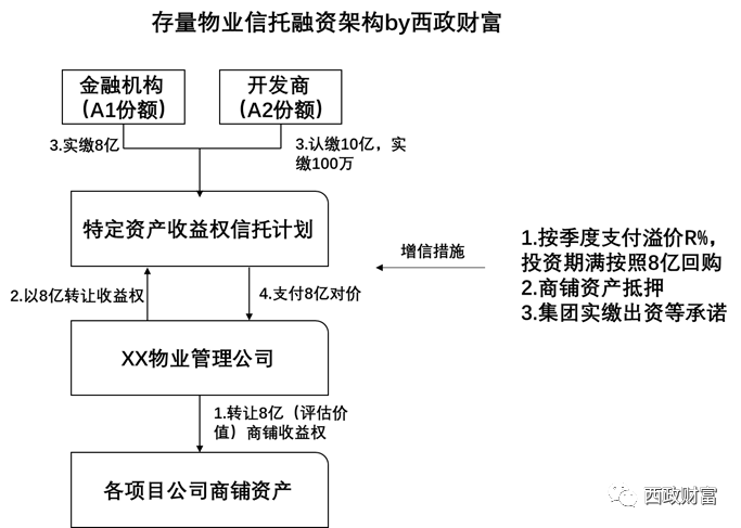 “資產(chǎn)收益權(quán)信托計劃”一直是信托機構(gòu)發(fā)行的最為典型的產(chǎn)品,“特定資產(chǎn)收益權(quán)轉(zhuǎn)讓+回購”則是該類產(chǎn)品的常見“打開”方式。同時,為了確保交易標的真實性,并保證交易有效性,收益權(quán)所對應(yīng)的基礎(chǔ)資產(chǎn)一般需作為擔保物抵押或質(zhì)押給信托公司。通過“資產(chǎn)收益權(quán)”方式將信托資金在使用在形式上包裝成一個投資或交易行為似乎既可以實現(xiàn)開發(fā)商在“三道紅線”監(jiān)管規(guī)定下融資出表的目的,又能解決信托機構(gòu)融資性信托額度不夠的問題。在實操層面,有的信托機構(gòu)在操作時不一定要求底層資產(chǎn)滿足432條件,但有的卻對底層資產(chǎn)滿足432條件有嚴格的準入要求。同樣,有的銀保監(jiān)認為在“特定資產(chǎn)收益權(quán)轉(zhuǎn)讓+回購”的模式下,涉及到回購即認定該類信托產(chǎn)品屬于融資類信托產(chǎn)品。以存量物業(yè)特定資產(chǎn)收益權(quán)信托融資為例,其產(chǎn)品基本架構(gòu)如下: