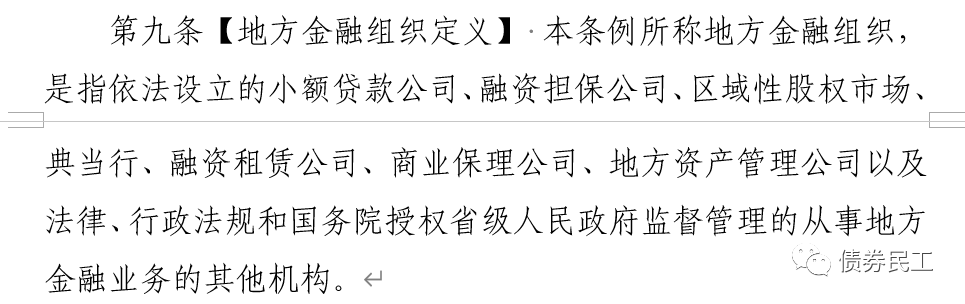 4、中國人民銀行于2021年12月31日發布了《地方金融監督管理條例(草案征求意見稿)》(以下簡稱“《管理條例》”),首次明確了地方金融組織的范疇,明確包括“小額貸款公司、融資擔保公司、區域性股權市場、典當行、融資租賃公司、商業保理公司、地方資產管理公司”。也就是說,上述所有的地方金融組織均應該納入監管范疇。