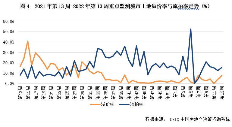 市場熱度方面。由于廈門、合肥本次集中出讓優(yōu)質(zhì)用地供應(yīng)比例大增,并且出讓門檻也較此前降低,因此兩城均出現(xiàn)了地價(jià)觸頂成交的現(xiàn)象,首輪土拍的平均溢價(jià)率分別達(dá)6.78%和11.21%,是已完成土拍城市中平均成交溢價(jià)最高的兩個(gè)城市。在此帶動下,本周重點(diǎn)監(jiān)測城市的溢價(jià)率也突破5%,回漲至7.7%。