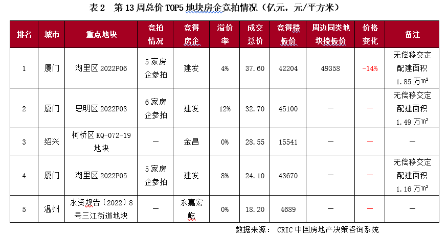 22城集中供地方面,本周廈門、合肥22年首輪集中土拍收官。從最終成交結(jié)果來看,合肥的成交規(guī)模最高,考慮于3月23日競品質(zhì)的15宗地,本周共有21宗地成交,總成交建面達(dá)202萬平方米;至此,合肥首輪土拍共成交24宗涉宅用地,共收金189.6億元。廈門計(jì)劃出讓10宗地,最終1幅提前撤牌,9幅順利成交,總成交建面達(dá)61萬平方米,共收金153.7億元。集中供地之外,主力成交地塊仍多以商辦為主,且大部分城市的成交建面均在50萬平方米以下,市場活躍度不高。