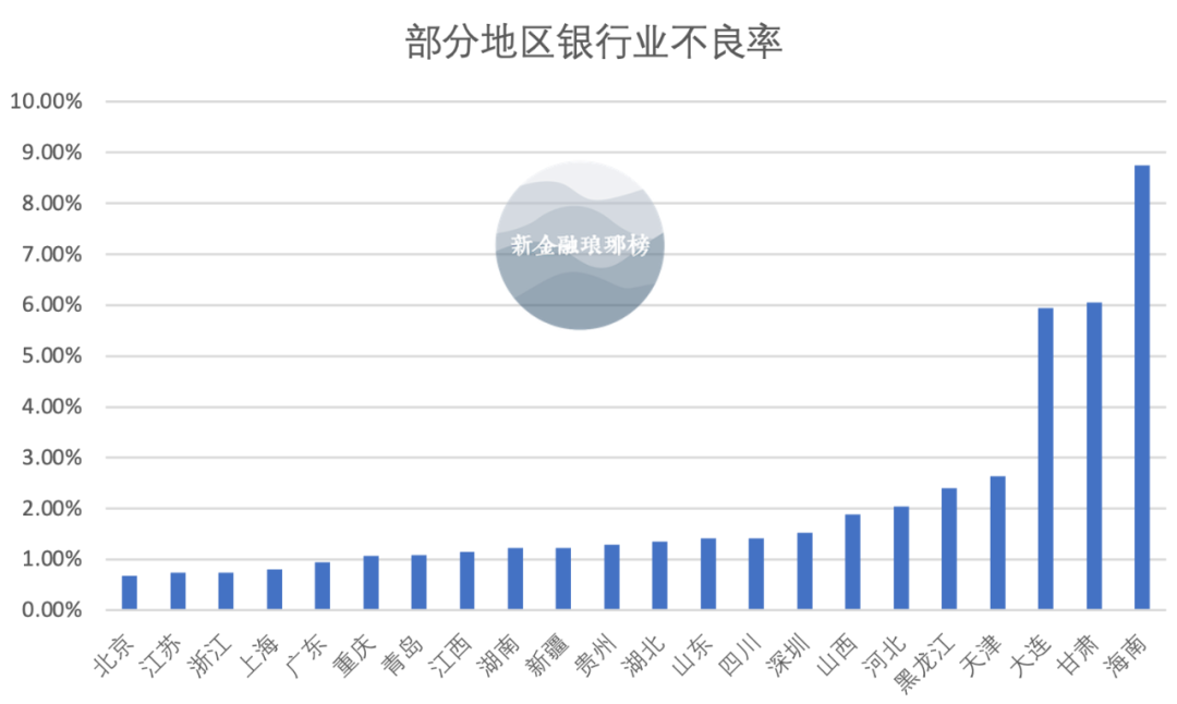 在披露了不良率數據的區域里,不良率最高的是海南,高達8.75%;其次是甘肅、大連,分別為6.06%、5.95%。它們也是僅有的不良率超過3%的區域。