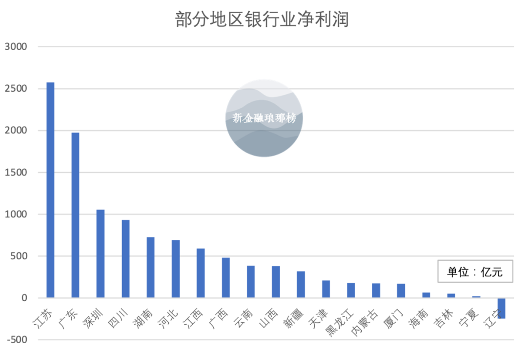從公布了凈利潤數據的區域來看,江蘇與廣東(不含深圳)最為突出,分別為2574.55億元、1972.98億元,深圳銀行業凈利潤也達到1055.23億元(雖然同比縮水超兩成)。這意味著,廣東省銀行業去年實現了3000億元凈利潤,占全國的比重達到12%。