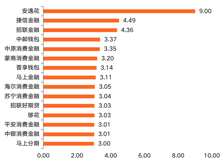 從日均活躍用戶的評分來看,安逸花APP表現最為突出,為9分;招聯金融APP和捷信消費金融APP分別為第二名(4.35分)和捷信消費金融(4.13分),其他消費金融APP均在3分左右。