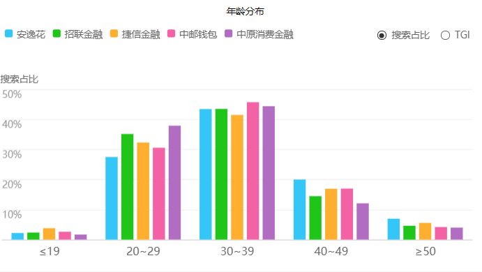用戶畫像反映了關注消費金融APP的用戶的年齡、性別和興趣分布。根據百度指數總結的用戶畫像可以看出,無論從年齡分布,還是性別、興趣分布來看,整體五款 APP 的用戶偏好相近,較為同質化。