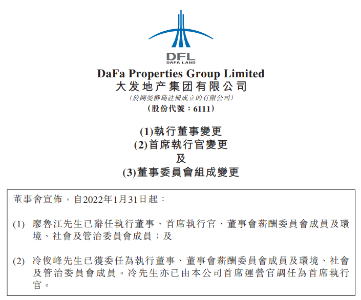 1月31日午間,大發地產發布公告稱,其首席執行官兼執行董事廖魯江因個人原因離職,大發地產原首席運營官兼高級副總裁冷俊峰接任。
