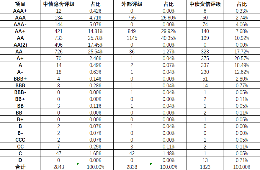 外部評級多集中于AAA、AA+及AA,然而,同樣的AAA,在中債隱含評級中可以區(qū)分為AAA+(1.59%)、AAA(17.75%)、AAA-(19.07%)、AA+(39.74%)以及AA(17.75%)等。