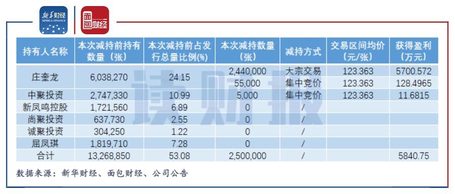 12月23日,公司再次發(fā)布可轉債減持公告,實控人莊奎龍和中聚投資在2021年12月13日至12月23日期間通過集中競價、大宗交易方式合計減持鳳21轉債250萬張。根據(jù)期間鳳21轉債交易均價123.363元/張計算,控股股東及其一致行動人此次合計套現(xiàn)3.08億元,合計獲得盈利近5841萬元。