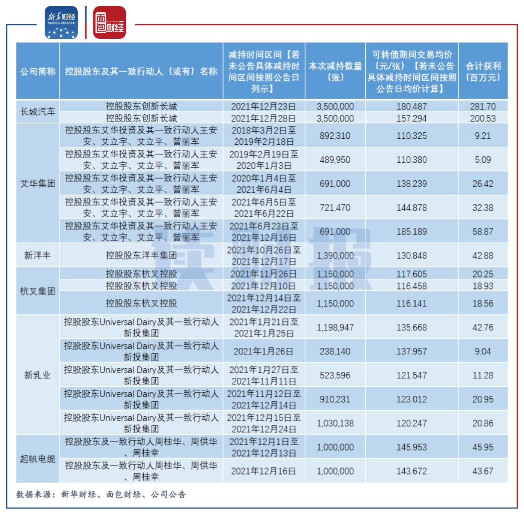 據(jù)不完全統(tǒng)計,僅2021年12月份以來,就有包括長城汽車、艾華集團、新洋豐在內的逾8家上市公司發(fā)布了控股股東減持可轉債的公告。