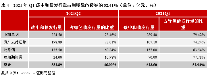 碳中和債角度,2021年Q2碳中和債發(fā)行量與Q1相比,有所下降。分債券品種看,碳中和資產支持證券發(fā)行規(guī)模有所增長,其余碳中和債券品種均有所下降。從碳中和債發(fā)行量占綠色債發(fā)行量的比重看,各品種碳中和貼標的積極性均有所下降,短期融資券碳中和貼標的積極性下降最明顯,或許是出于成本考慮,碳中和債券需要第三方機構的評估認證。