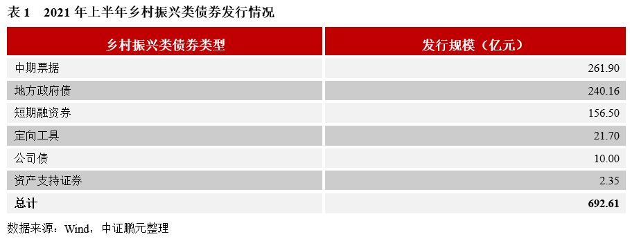 今年以來至2021年6月31日,債券市場鄉(xiāng)村振興類債券共發(fā)行692.61億元。從債券類型看,涵蓋了中期票據、地方政府債、短期融資券、定向工具、公司債和資產支持證券。其中,鄉(xiāng)村振興中期票據發(fā)行規(guī)模最大,為261.90億元,接下來是鄉(xiāng)村振興地方政府債(240.16億元)、鄉(xiāng)村振興短期融資券(156.50億元),其他類型發(fā)行量較少。
