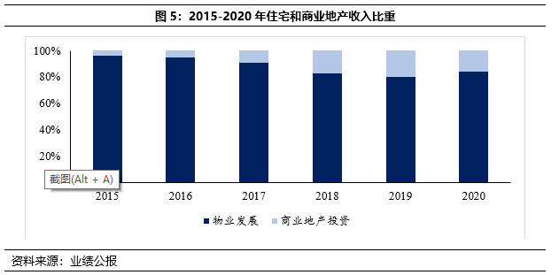 從營(yíng)收占比上看,依然以房地產(chǎn)銷售為主,近年來(lái)隨著商業(yè)地產(chǎn)的不斷投入,商業(yè)地產(chǎn)出租和住宅銷售收入構(gòu)成中,商業(yè)地產(chǎn)的占比逐年上升。2020年,合生創(chuàng)展實(shí)現(xiàn)住宅銷售收入190.75億港元,折合人民幣160.23億元;商業(yè)地產(chǎn)收入36.25億港元,折合人民幣30.45億元(匯率均按照1:0.84)。