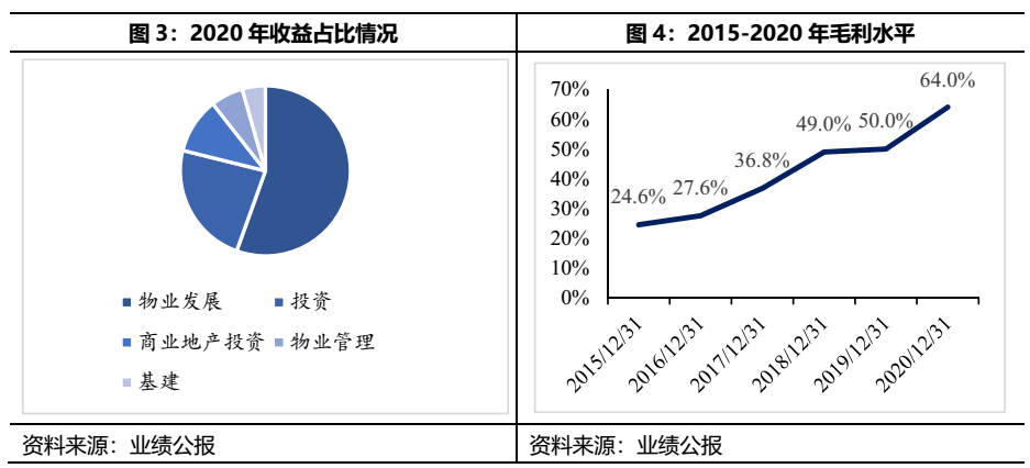 2020年集團(tuán)業(yè)務(wù)主要分為住宅地產(chǎn)、商業(yè)地產(chǎn)、物業(yè)管理、基建和投資五大板塊,各板塊收入占比如下圖所示。2019年合生的業(yè)務(wù)版圖新增了基建業(yè)務(wù),2020年繼續(xù)新增投資板塊,公司的業(yè)務(wù)版圖不斷拓展,是近幾年的一大轉(zhuǎn)變。2020年投資業(yè)務(wù)財(cái)報(bào)上的數(shù)據(jù)顯示不論是在營(yíng)收規(guī)模上還是盈利情況上表現(xiàn)均較為優(yōu)異,貢獻(xiàn)了23%的收入還拉高了整體的毛利。2020年,公司的毛利高達(dá)64%,遠(yuǎn)遠(yuǎn)超過(guò)地產(chǎn)公司的平均水平(25%),公司對(duì)于高毛利的解釋是由于新增投資業(yè)務(wù)表現(xiàn)突出所致。
