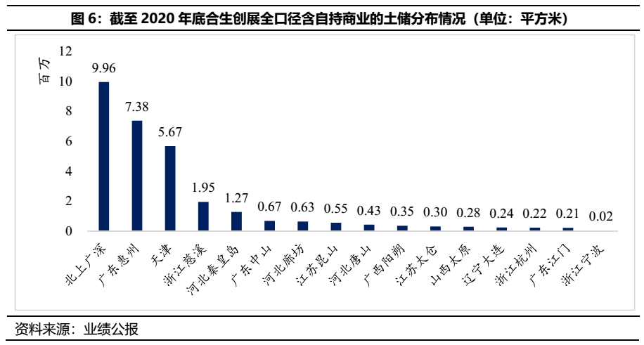 公司項(xiàng)目集中在環(huán)渤海、珠三角和長(zhǎng)三角地區(qū),主要分布于北上廣等一線城市。截至2020年底,合生創(chuàng)展位于以上四個(gè)城市的總土儲(chǔ)面積達(dá)到9.96百萬(wàn)平方米,占公司總土儲(chǔ)面積的32.72%。由此,公司的項(xiàng)目主要分布在一二線城市,整體土儲(chǔ)質(zhì)量較好。