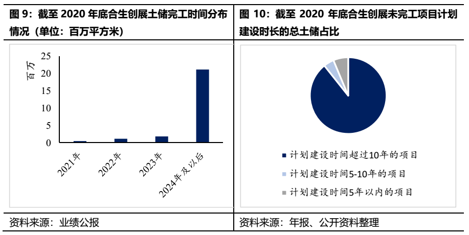 目前,由于歷史囤積的慢去化土儲(chǔ)規(guī)模很大,合生整體的項(xiàng)目周期依然很長(zhǎng)。截至2020年底,公司披露的項(xiàng)目總計(jì)87個(gè),其中未完工的項(xiàng)目53個(gè),這些項(xiàng)目中未完工面積占比高達(dá)90.67%。時(shí)間節(jié)點(diǎn)上看,以上絕大多數(shù)的未完工面積都將于2024年及以后完工,項(xiàng)目周期之長(zhǎng)顯而易見(jiàn)。而進(jìn)一步對(duì)這些未完工項(xiàng)目進(jìn)行整理,發(fā)現(xiàn)約89%的項(xiàng)目開(kāi)發(fā)時(shí)間超過(guò)10年,部分在廣州、惠州、北京的土儲(chǔ)拿地時(shí)間超過(guò)了20年,這些土地當(dāng)年的拿地成本很低,并且區(qū)位均較好,未來(lái)隨著這部分土儲(chǔ)逐漸建設(shè)銷售,勢(shì)必會(huì)帶來(lái)很高的溢價(jià)。