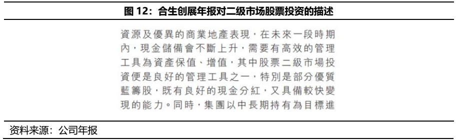 按照年報(bào)中對(duì)該板塊業(yè)務(wù)的描述,公司股權(quán)投資的定位是高新科技和醫(yī)療科技類公司,投資范圍包括一級(jí)市場(chǎng)和二級(jí)市場(chǎng),一級(jí)市場(chǎng)披露的投資為Scientia Technologies Limited,為注冊(cè)于開(kāi)曼群島的投資控股公司,合生于2020年共計(jì)投入6億美元(持股7.407%),根據(jù)合生年報(bào)的描述這家公司疑似為平安智慧城的母公司賽安迪科技,而平安智慧城市主要運(yùn)用高新科技服務(wù)于城市管理,目前的經(jīng)典案例集中在廣州深圳地區(qū)。平安近年自己打的標(biāo)簽為“金融+科技”,但是在科技領(lǐng)域乏善可陳,無(wú)論是集團(tuán)自己的科技板塊或者對(duì)外投資的版塊,均表現(xiàn)一般。合生跟投平安的科技投資標(biāo)的,前景難言。股票二級(jí)市場(chǎng)主要投資的公司均為一些藍(lán)籌股,包括平安保險(xiǎn)、匯豐控股、中國(guó)移動(dòng)等。截至2020年末,公司披露的按照公允價(jià)值計(jì)量的資產(chǎn)規(guī)模為220.21億港元,按照1:0.84的匯率折合人民幣184.98億元,占總資產(chǎn)比重6.15%。